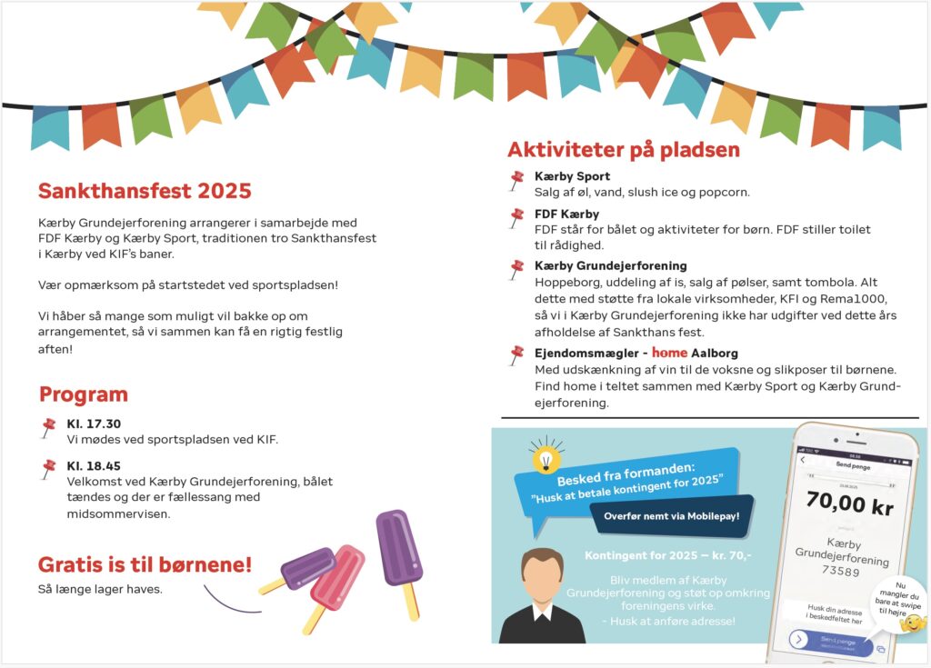 Kærby Grundejerforening inviterer i samarbejde med FDF Kærby, Kærbysport og Home Aalborg traditionen tro til Sankt Hansfest i Kærby ved KIF’s baner mandag den 23. juni 2025.